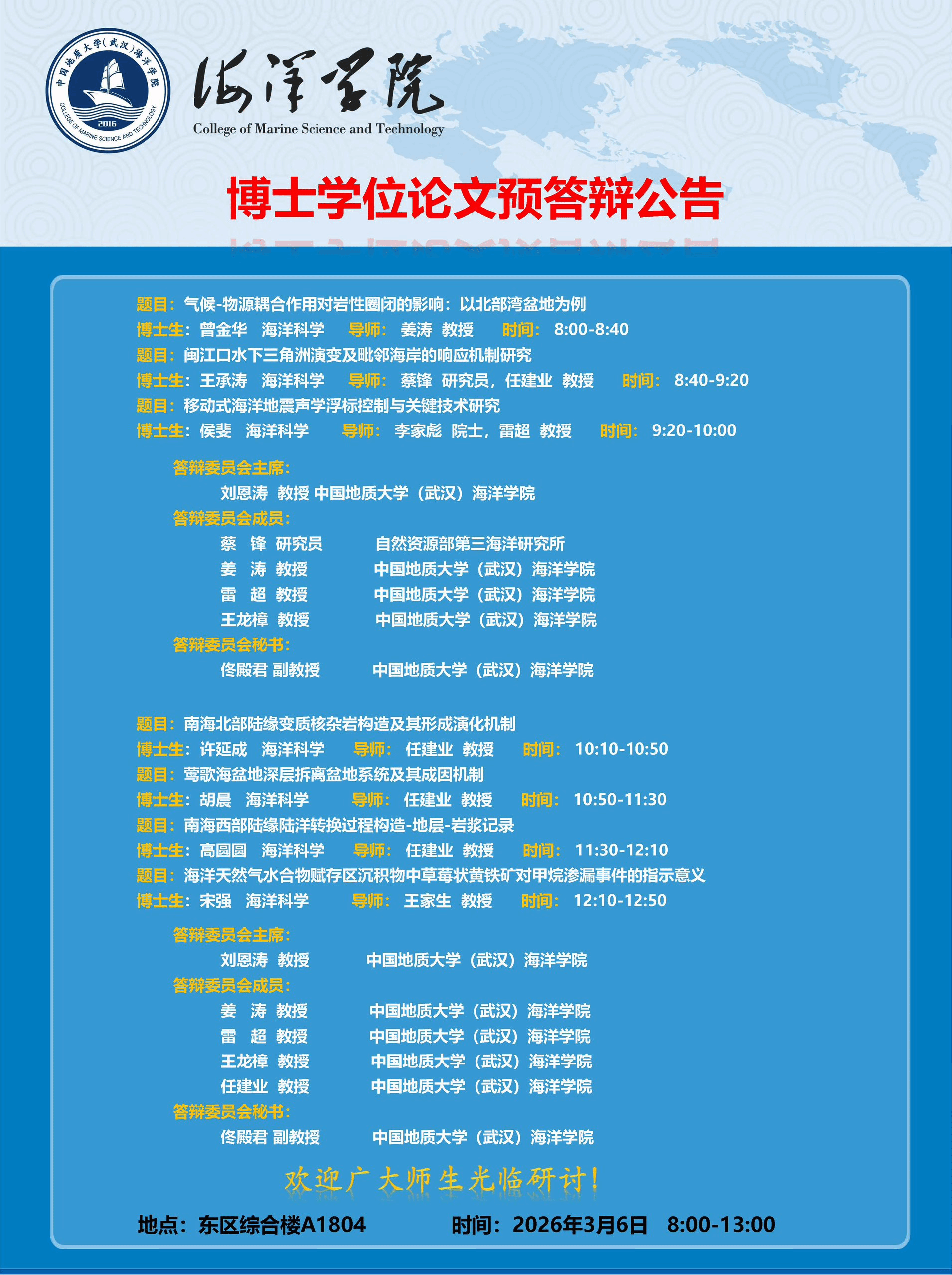 海洋学院2026年春博士学位论文预答辩公告(3月6日)