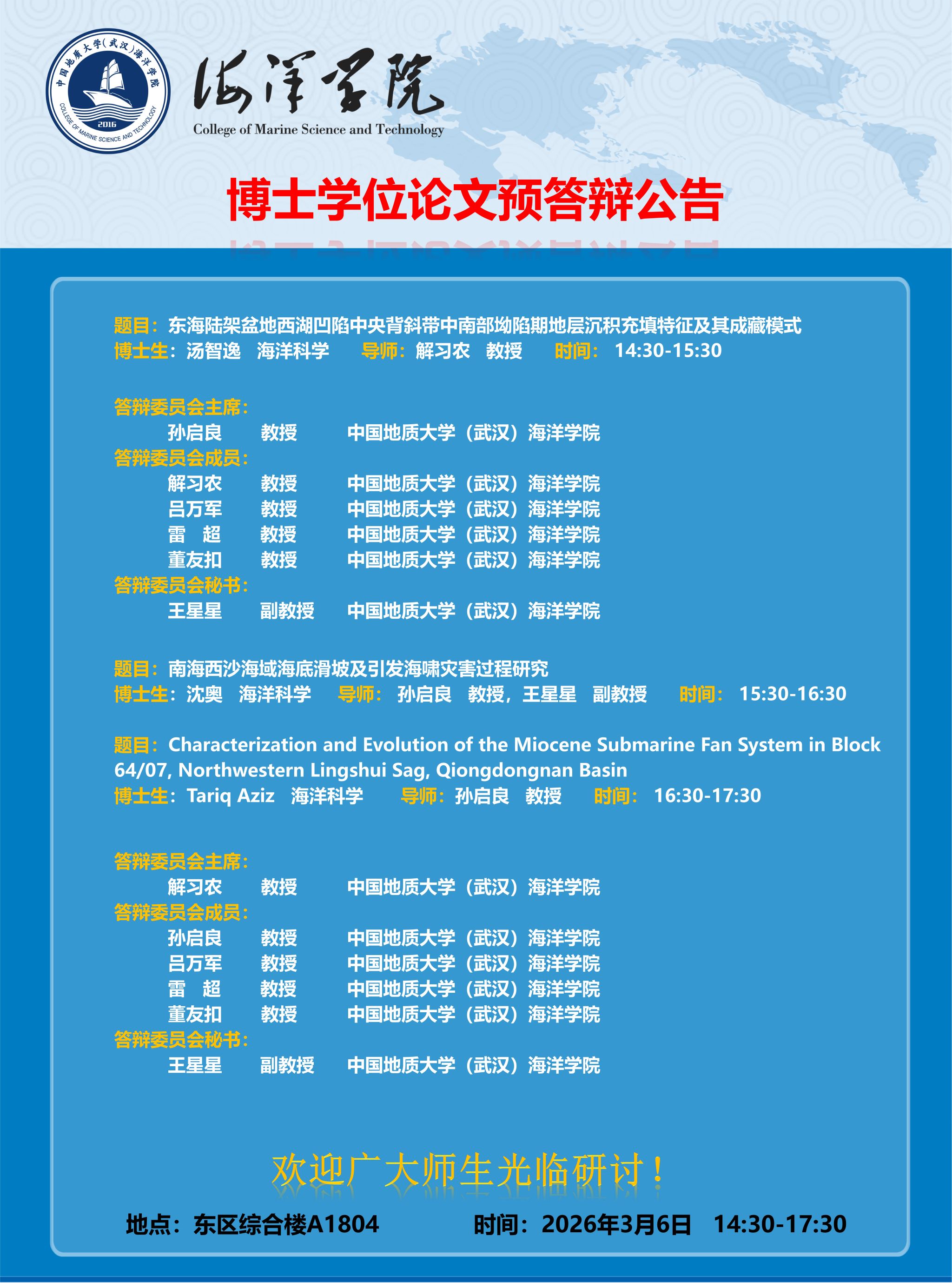 海洋学院2026年春博士学位论文预答辩公告(汤智逸等3月6日)
