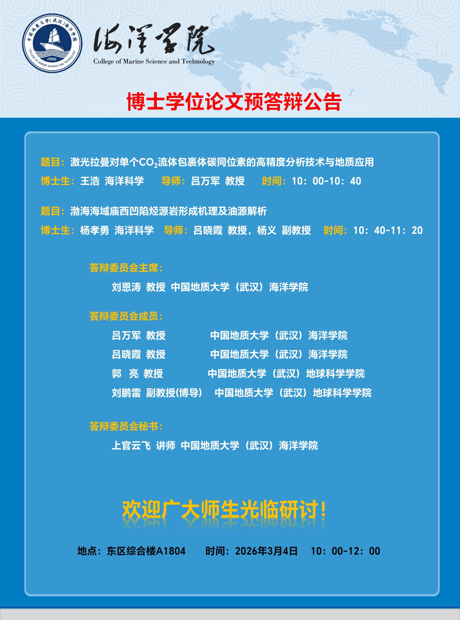 海洋学院2026年春博士学位论文预答辩公告(汤智逸等3月6日)
