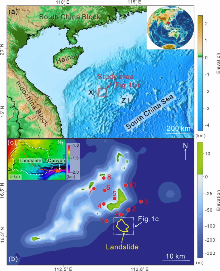 近日,中国地质大学(武汉)海洋学院孙启良教授团队在《Ocean Modelling》发表了题为“Island morphological influences on landslide-generated tsunami propagation and resonance: A case study in the Xisha Islands, South China Sea”的论文。研究聚焦于南海西沙群岛岛礁区,通过数值模拟与数据分析,深入探讨了海底滑坡引发海啸的传播机制及岛礁地形对海啸波的影响。