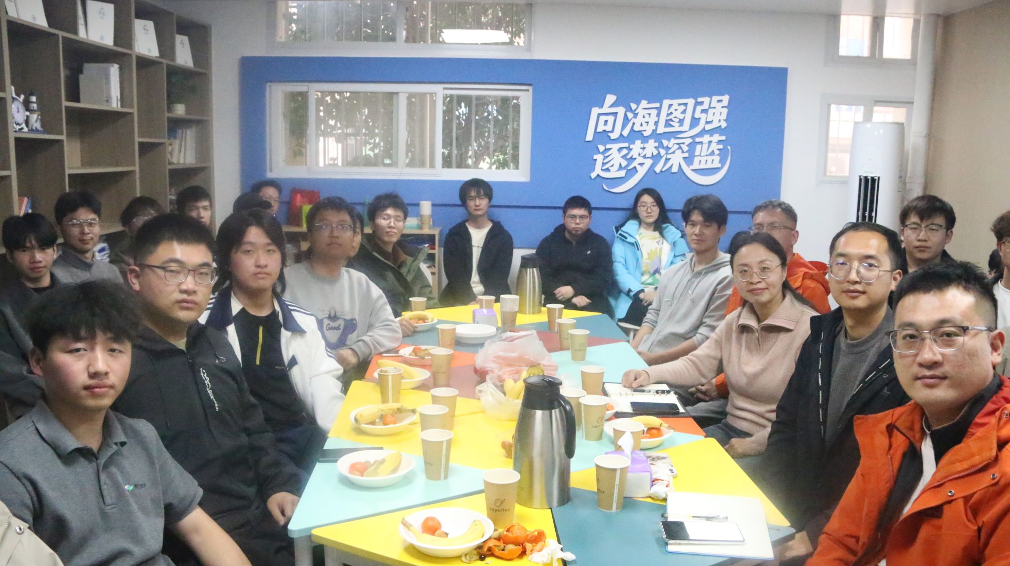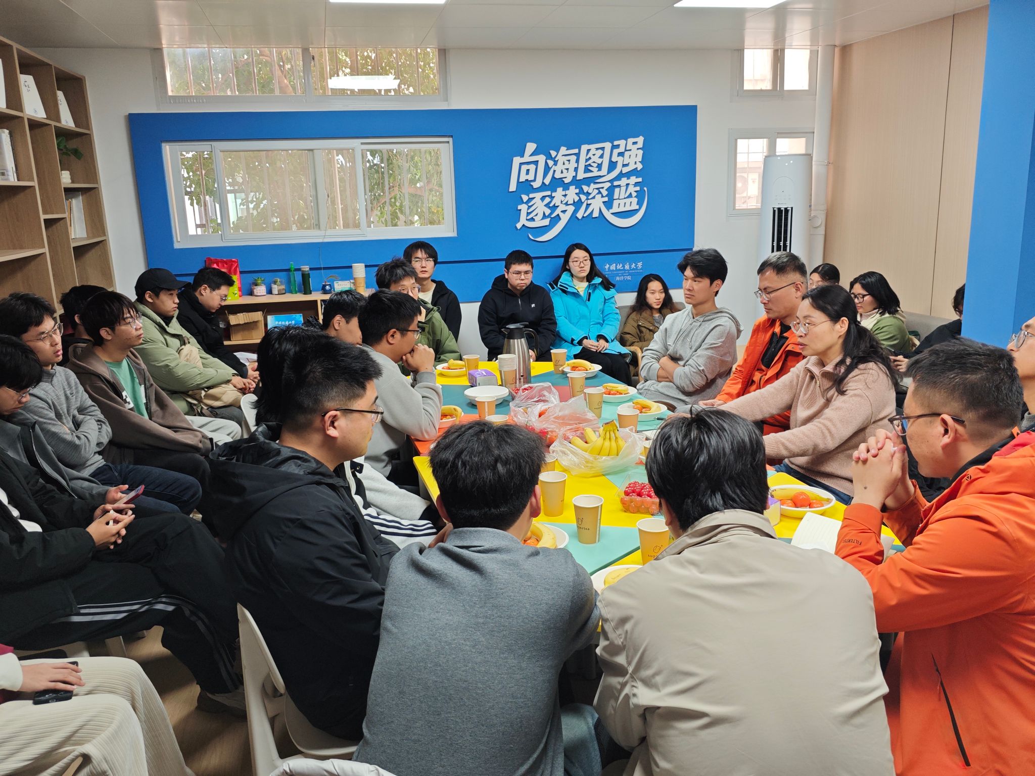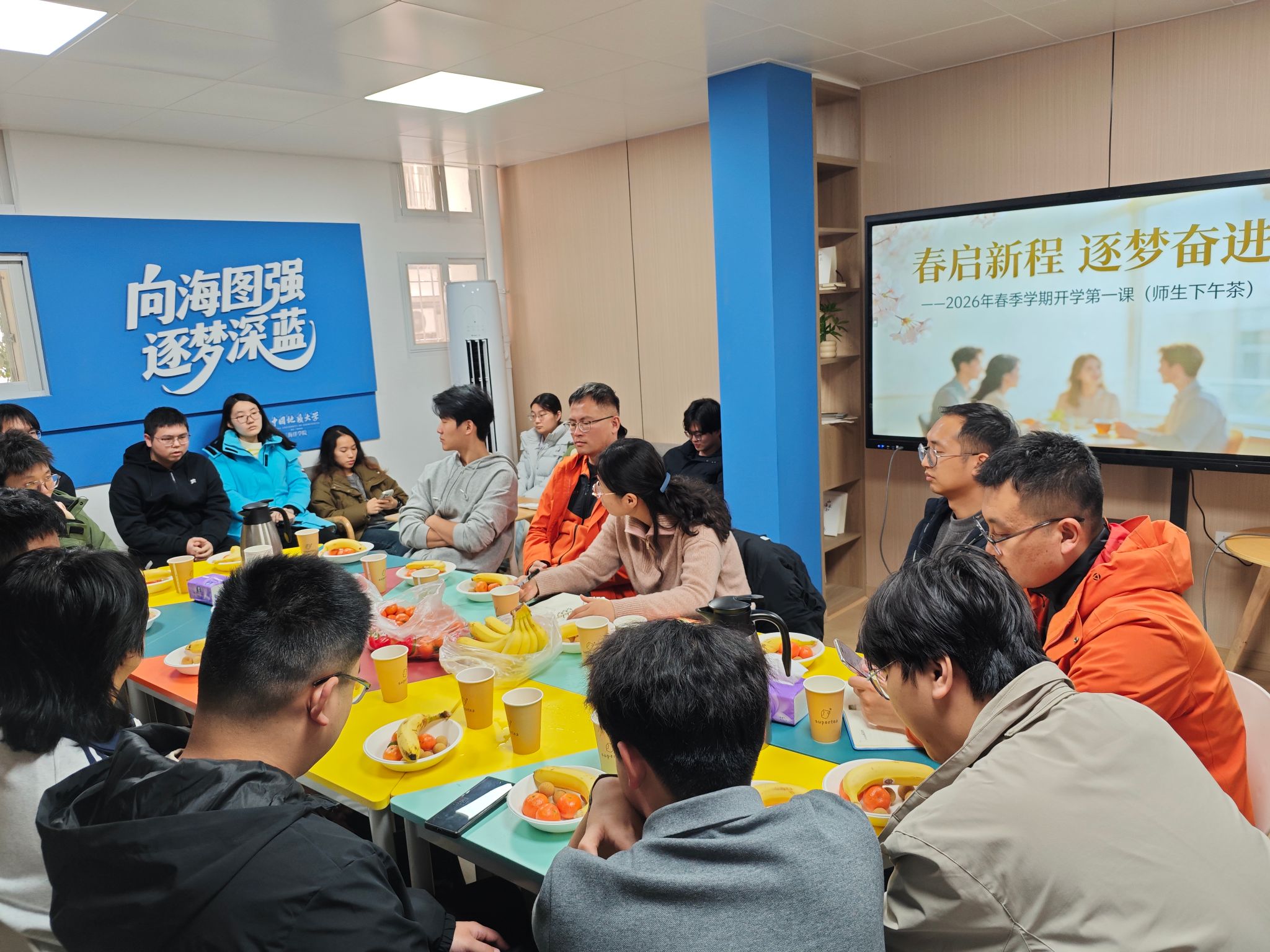为了解大四同学考研和就业动态,为同学们升学就业提供精准指导,2026年3月5日下午,海洋学院在55栋公寓社区驿站举办2026年春季学期开学第一课暨第二十期师生下午茶。学院党委副书记钟苹、2022级班主任匡洋民、于男参加活动。团委书记、辅导员陈波主持活动。