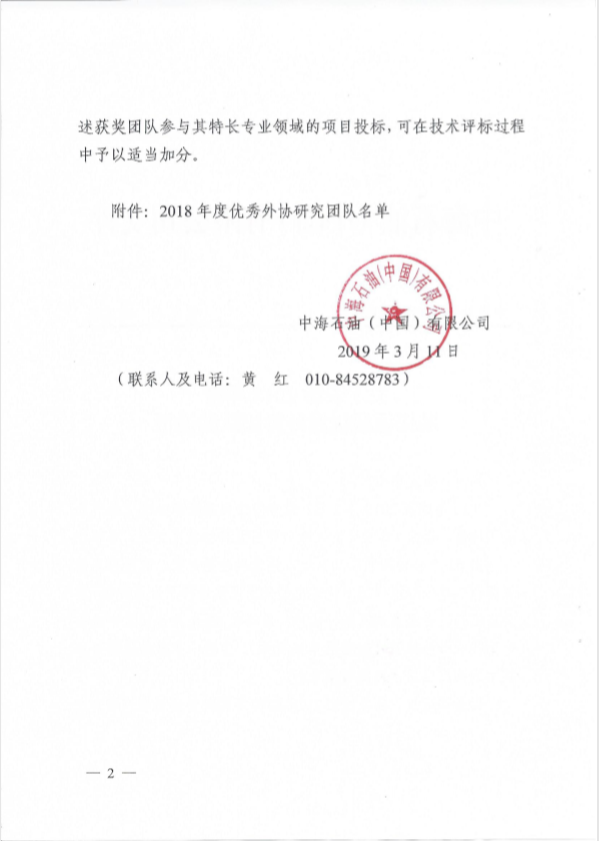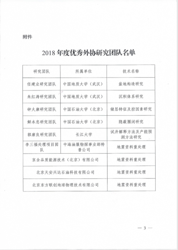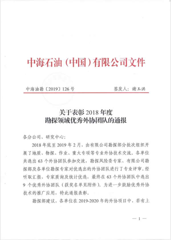近日,中海石油(中国)有限公司发布通告,我院任建业教授研究团队获评勘探领域2018年优秀外协团队。