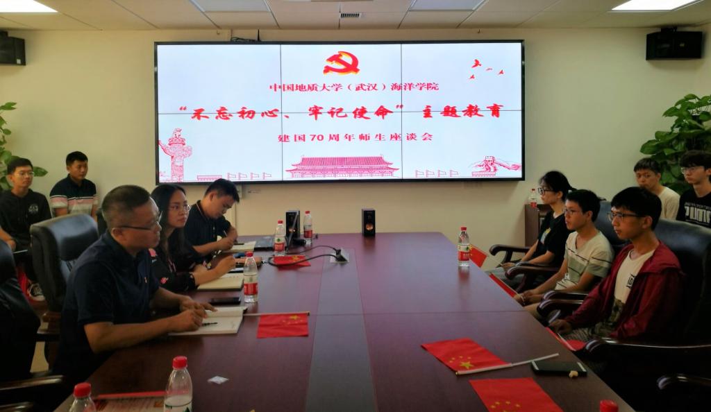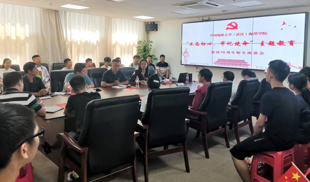 2019年10月1日,海洋学院师生齐聚一堂共同观看了北京天安门前的阅兵现场直播,阅兵式观看结束后学院师生在东教A座1804召开了“不忘初心,牢记使命”主题教育暨庆祝中华人民共和国成立七十周年师生交流座谈会。出席本次座谈会的学院领导有海洋学院党委书记成军、党委副书记钟苹,海洋学院副院长姜涛、陈刚。