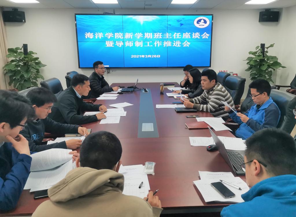 为进一步加强学院学风建设和班级管理,推进学生工作队伍建设,3月26日下午,海洋学院在东教A座1804会议室召开新学期班主任座谈会暨导师制工作推进会。学院副院长姜涛、党委副书记钟苹、各班班主任、2020级本科学务指导导师和全体学工组成员参加活动,座谈会由学院团委书记陈波主持。