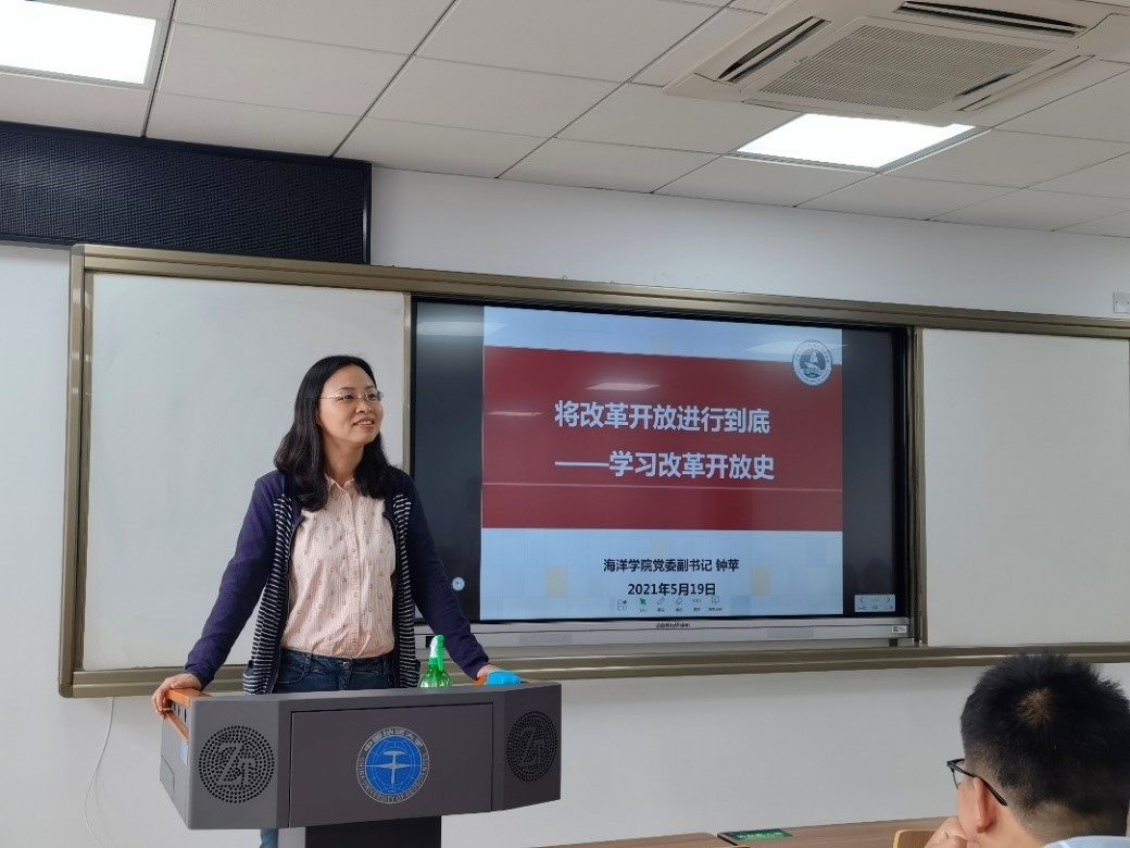 5月20日下午14:30分,海洋学院党委副书记钟苹在东区综合楼A座210,带领全院入党积极分子深入学习改革开放史。她围绕“为何要走改革开放之路?”“改革开放史基本脉络”“将改革开放进行到底”三个主题,从“为什么”“怎么走”“有何用”三个方面深刻阐释了改革开放的历史,帮助同学们更加科学地总结历史经验,清醒地认识中国国情,正确地把握历史规律,从而增强道路自信、制度自信、理论自信、文化自信。