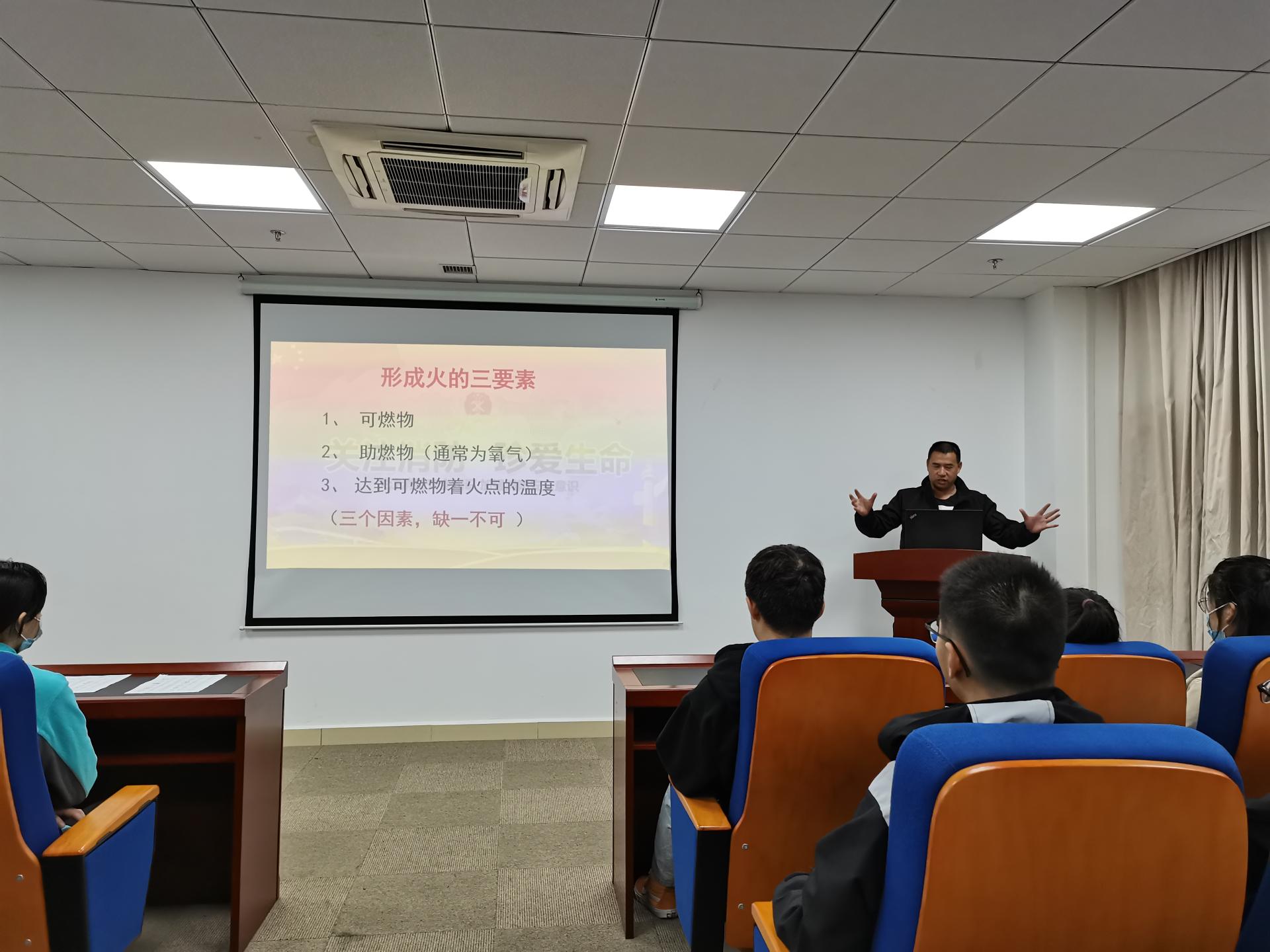 在专题培训环节。刘老师通过相关的法律知识,结合自己多年一线安全事故处理的经验,为同学们讲述了形成火的三要素和灭火的四种方法,让同学们先充分了解到火灾的形成条件和灭火的要诀;以对话的形式,介绍了现代火灾特点、学生宿舍常见的火灾类型及实验室安全事故,并结合我校真实发生的火灾案例,让同学们了解到火灾给人带来了身体上和财产上的极大损害,从而更加深刻体会到防范的必要性;最后通过对上述案例进行深刻反思,总结安全工作原则,也让同学们深入领会“四懂四会四能力”。