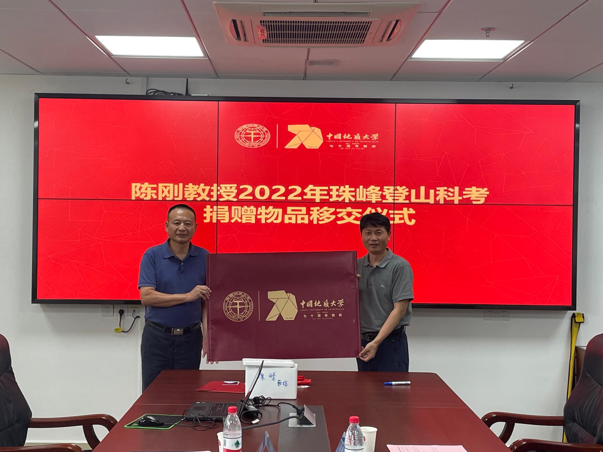 图书档案与文博部部长刘先国,校团委副书记吴迪,环境学院副院长孙自永代表各单位接收陈刚教授珠峰登山科考捐赠物品。
