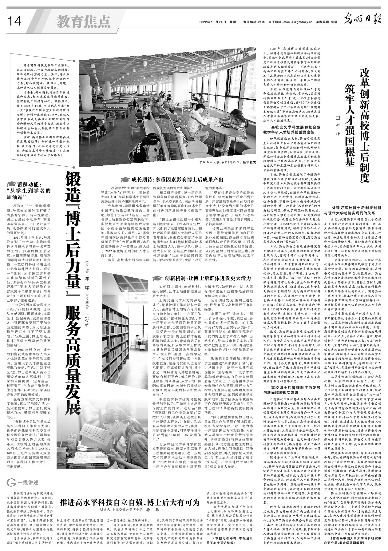 2022年10月24日,光明日报发表了一篇题为《锻造“博士后力量” 服务高质量发展》的报道。在“成长期待:多重因素影响博士后成果产出”版块中,报道了我院博士后杨姗姗项目申报经历:今年春节,杨姗姗准备申请中国博士后基金第71批面上资助,却苦于没有申请经验。在学校博士后管理办公室的联系下,多位校内外顶尖导师组成专家团,手把手指导她确定课题名称、修改申报书。最终,以“寡营养海域聚球藻好氧产甲烷及其机制的研究”为研究课题,她不仅成功获得了一等资助,还入选了2022年度博士后创新人才支持计划。