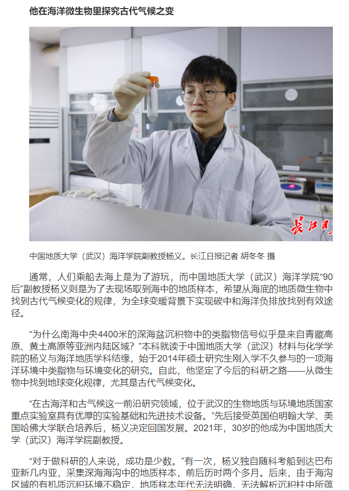 其中,长江日报记者对话中国地质大学(武汉)海洋学院杨义副教授,报道他在海洋微生物里探究古代气候之变:通常,人们乘船去海上是为了游玩,而中国地质大学(武汉)海洋学院“90后”副教授杨义则是为了去现场取到海中的地质样本,希望从海底的地质微生物中找到古代气候变化的规律,为全球变暖背景下实现碳中和海洋负排放找到有效途径。“做科研不枯燥,满足好奇心很有意思。”杨义说,他要一直坚持下去,实实在在拿出国家需要、对社会有用的科研成果。