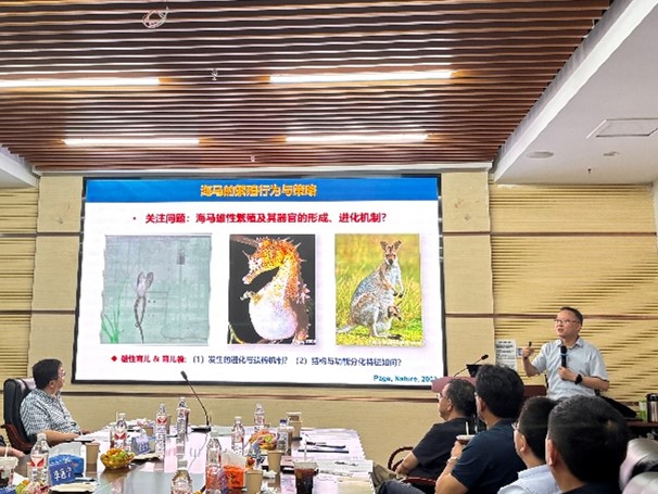 中国科学院南海海洋研究所林强研究员应邀作《印-太海龙科鱼类适应辐射与性状演化》报告。林强研究员从生命起源引入他的报告,表明了印-太海域是全球海洋生物多样性中心、但不一定是种化中心的观点,提出了海洋物种多样性形成机制、扩散与适应辐射模式等问题。随后,林强研究员以海龙科鱼类为例,讲述了其多样性的形成、演化和遗传机理,分别从印-太海域向西到印度洋海域,向南到南澳海域,向北到中国沿海区域进行了海龙科生物的外形和生态适应性的讲解,同时分析了海龙科鱼类伴随生态位分化产生的本地适应性。
