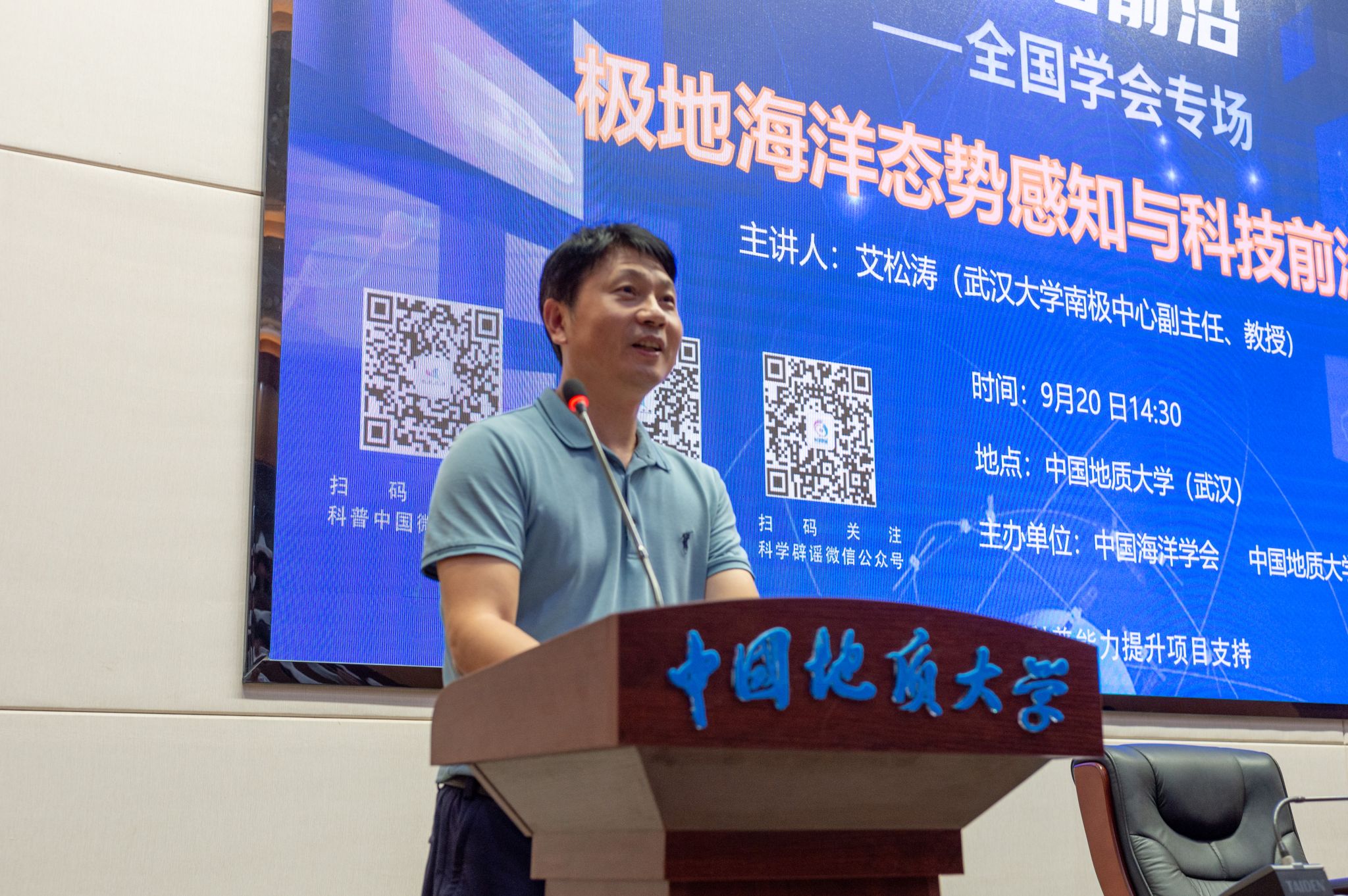 (通讯员李盼盼)以“提升全民科学素质,协力建设科技强国”为主题的2024年全国科普日活动正在火热进行中。为学习传承科学家精神、激发海洋学子对极地科考的兴趣,9月20日下午,中国地质大学(武汉)和中国海洋学会邀请中国南极测绘研究中心副主任、武汉大学艾松涛教授开展题为《极地海洋态势感知与科技前沿》的专题科普讲座。海洋学院副院长陈刚、宫勋,陈波老师及海洋学院本研学生参加。海洋学院副院长陈刚教授代表学院全体师生对艾松涛教授的到来表示热烈欢迎,并简要介绍了艾松涛教授的科研及工作经历。