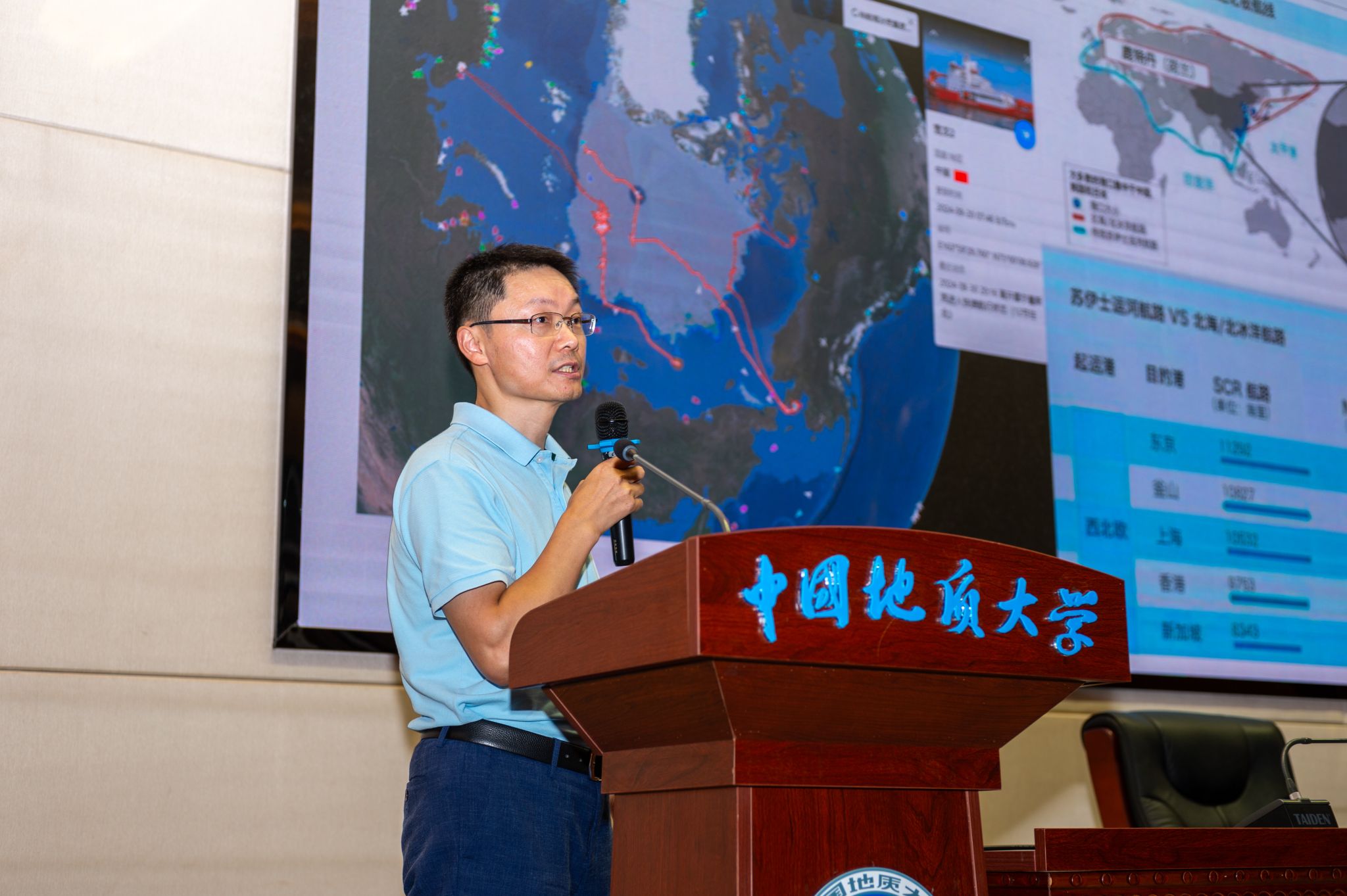 艾松涛教授的讲座聚焦极地海洋概况、极地信息服务进程、极地态势感知、以及极地科技前沿和治理展望五个层次。他首先从南北极的全球视角出发,图文并茂展示了人类初次发现和到达南北极地以及在海平面变化等方面影响下的人类生存挑战。结合海洋专业特色,艾松涛教授着重介绍了我国当前在极区海洋测绘方面、极地时空信息服务研究等方面的进展,并指出要始终坚持自立自强、自主创新的极地科考建设之路。