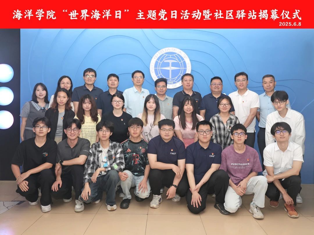 2025年6月8日,在第17个“世界海洋日”暨第18个全国海洋宣传日之际,为深化新时代立德树人工程,贯彻海洋强国战略及教育部“一站式”学生社区建设要求,海洋学院在55栋公寓一楼学生社区驿站举行“世界海洋日”主题党日活动暨学生社区驿站揭幕仪式。自然资源部第一海洋研究所研究员李传顺、党委学生工作部部长朱丹、后勤保障部宿舍管理中心主任张红兵、海洋学院党委书记刘国华、副院长陈刚、二级教授郑彦鹏、团委书记陈波出席活动。学生党员代表、学生干部代表和毕业生代表共同参加。活动由学院党委副书记钟苹主持。