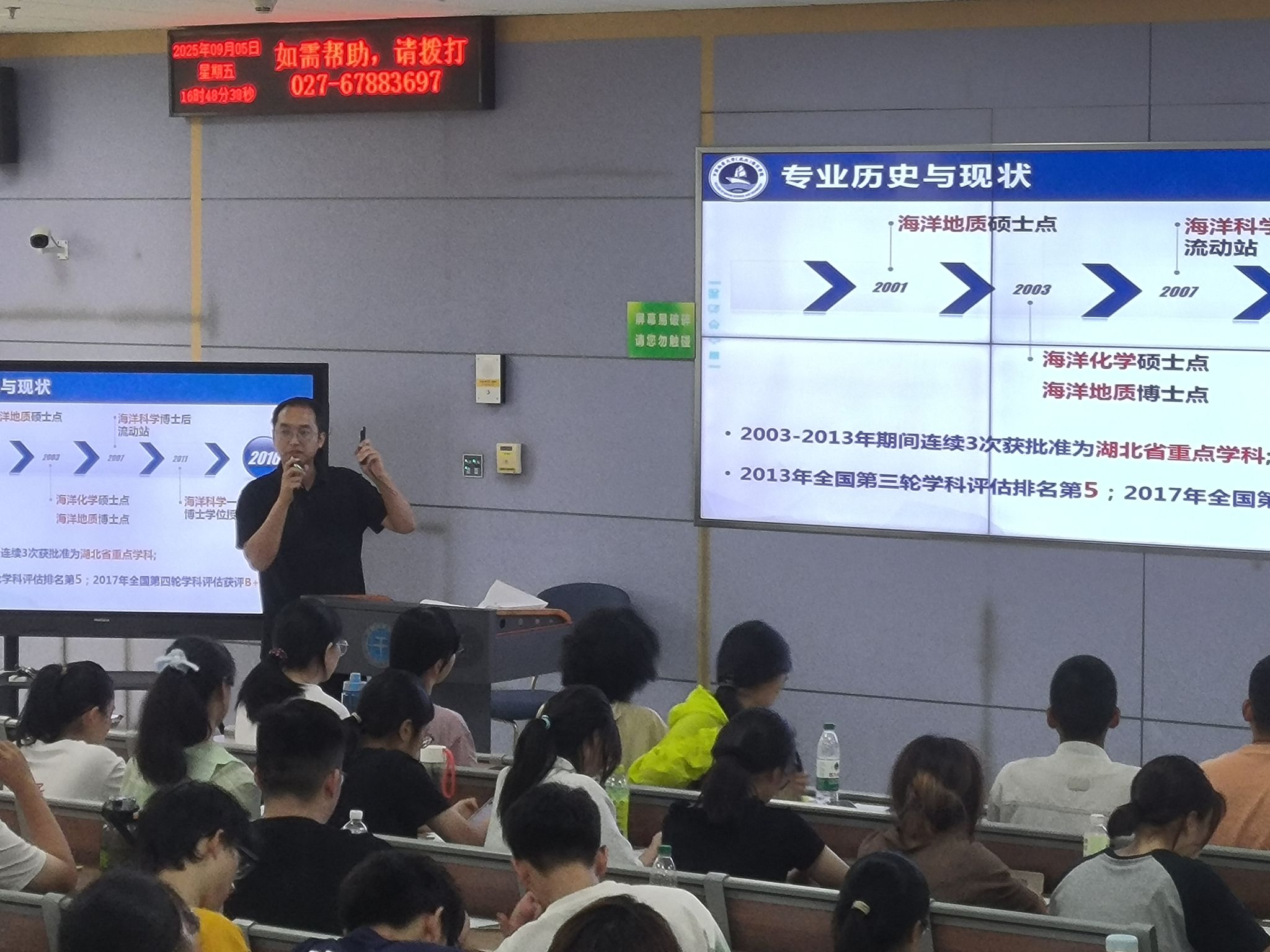 9月4日晚上,傅安洲老师为同学们讲述的“我们的历史与精神”讲座,回望学校自建校以来走过的峥嵘岁月,深刻理解了“艰苦朴素、求真务实”校训的深刻内涵与时代价值。从地质人“以献身地质事业为荣、以艰苦奋斗为荣、以找矿立功为荣”的“三光荣”传统,到一代代地大人为国家能源资源安全、生态文明建设所做出的卓越贡献,新生们感受到的不仅是一所大学的历史,更是一种精神的传承。这门课为新生们系好了大学生涯的“第一粒扣子”,引导他们思考如何将个人成长融入学校发展和国家需要,奠定了坚实的思想基础。