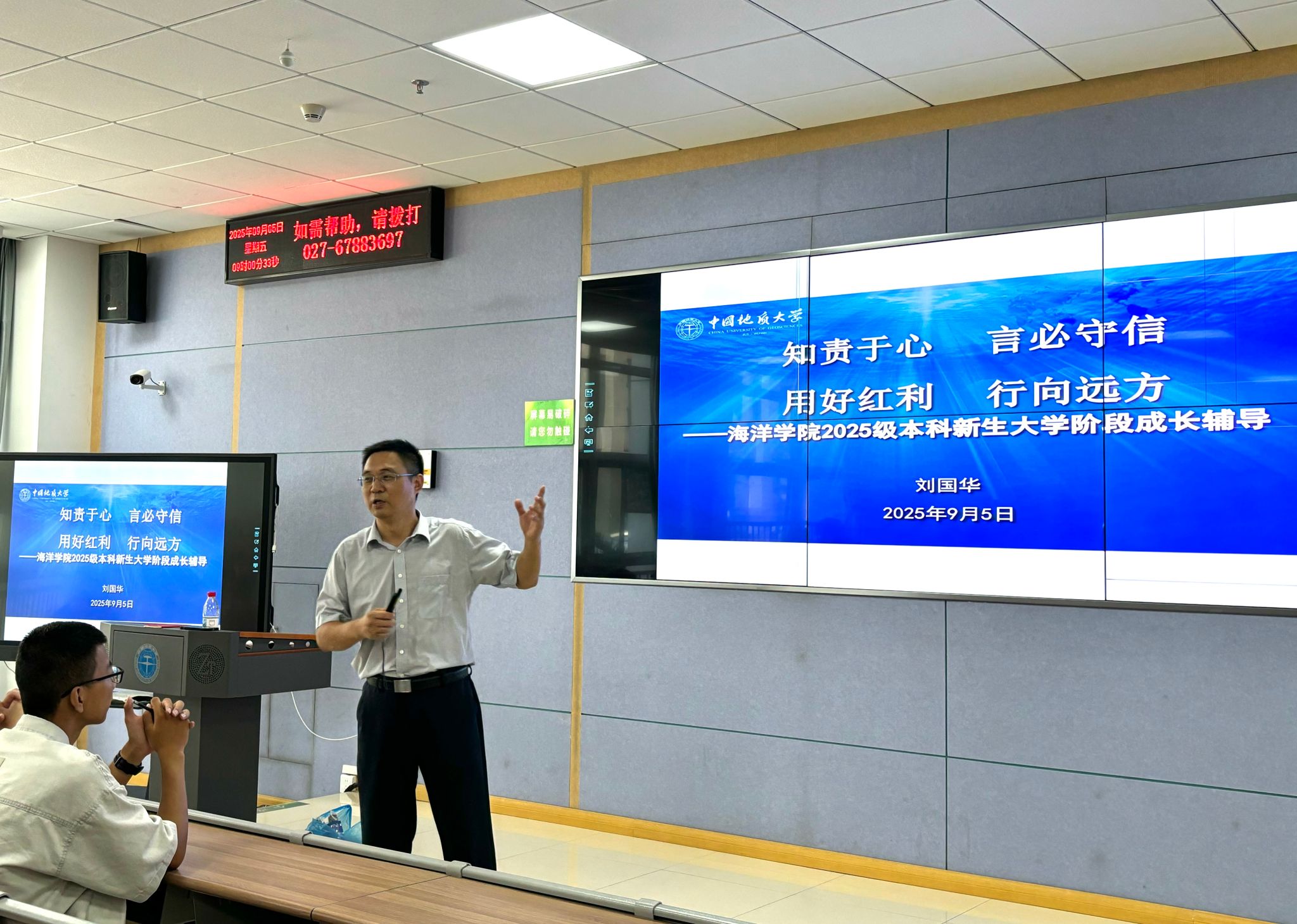 上一环节在同学们热烈掌声中结束后刘国华书记以《难忘(南望)迹忆》,展示了学院迎新现场、家长见面会、院领导到宿舍看望新生等情景,同时引入主讲内容的第二模块《自我赶考》:他以大学四年重要时间轴为脉络,和大家分享如何让自己始终坚定信念、遵规守纪、学业为首、全面发展,真正做到能静心、明目标、善思考、勇创新、入主流;他讲到海洋学院学子在本专业学什么、解决什么问题、怎样解决问题,如何主动出击学会用好时间、资源、能力等红利,从“被动接收知识”转向“主动规划资源”,在学思践悟中敢于勇于改变自己,逐步提升自己毕业后的核心竞争力。