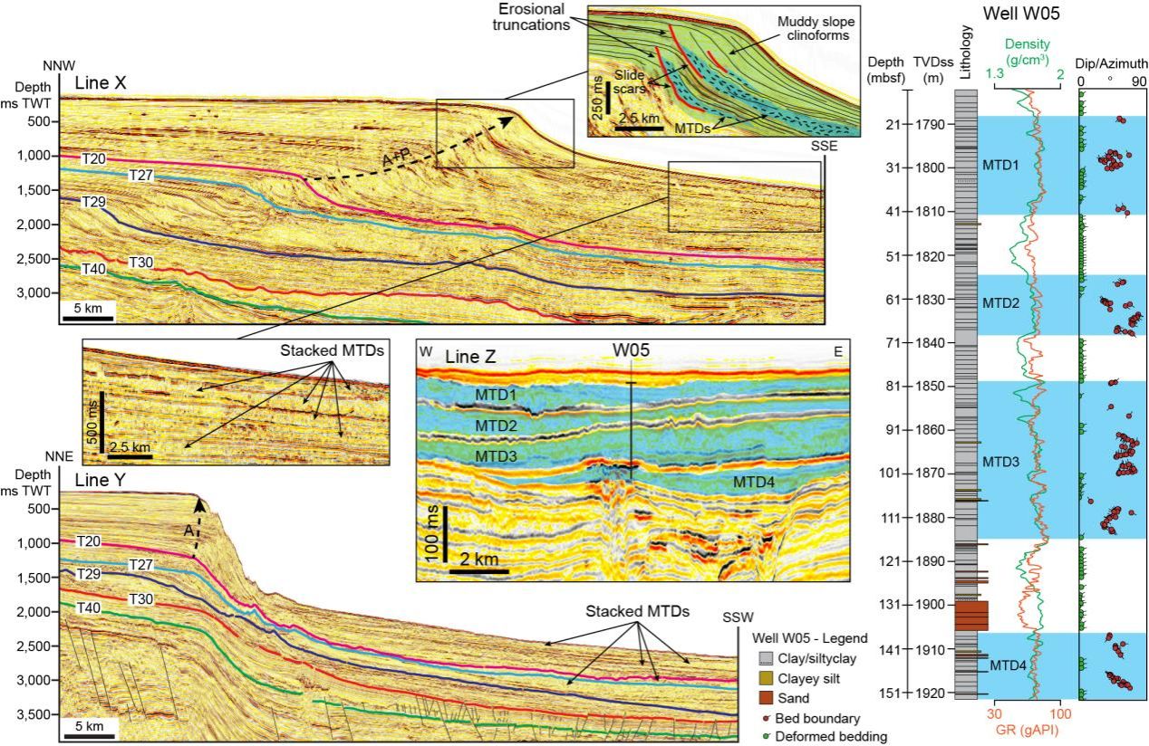 2. (左)地震剖面,展示了穿过1区(X测线)加积-进积地层样式以及4区(Y测线)加积(A地层样式Z测线穿过W05井,井上蓝色部分为解释的块体搬运沉积(MTD)。TWT—双程旅行时。(右W05井的地层柱状、密度测井曲线以及地层倾角图。蓝色区域表示MTDmbsf—海底以下米数;TVDss—海底以下真垂直深度。