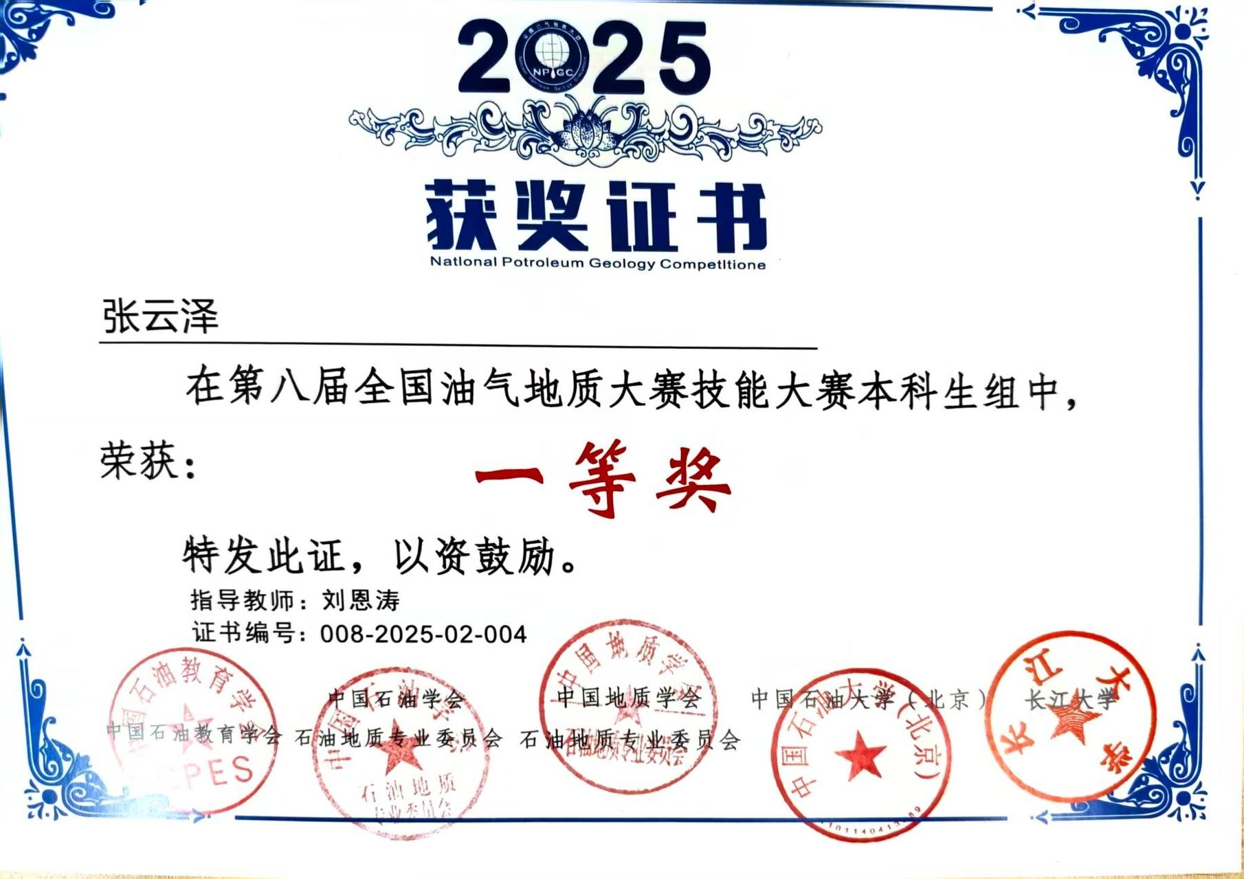 在科研领域,张云泽从不甘落后。他作为主要成员参与两项国家级大学生创新创业训练计划项目并成功结题,将课堂所学转化为实践成果;竞赛中,他斩获全国油气地质大赛一等奖、全国智慧海洋大数据应用创新大赛优胜奖等荣誉,用实力证明了科研能力。这些探索不仅提升了他的专业素养,更培养了他团队协作与解决问题的能力。