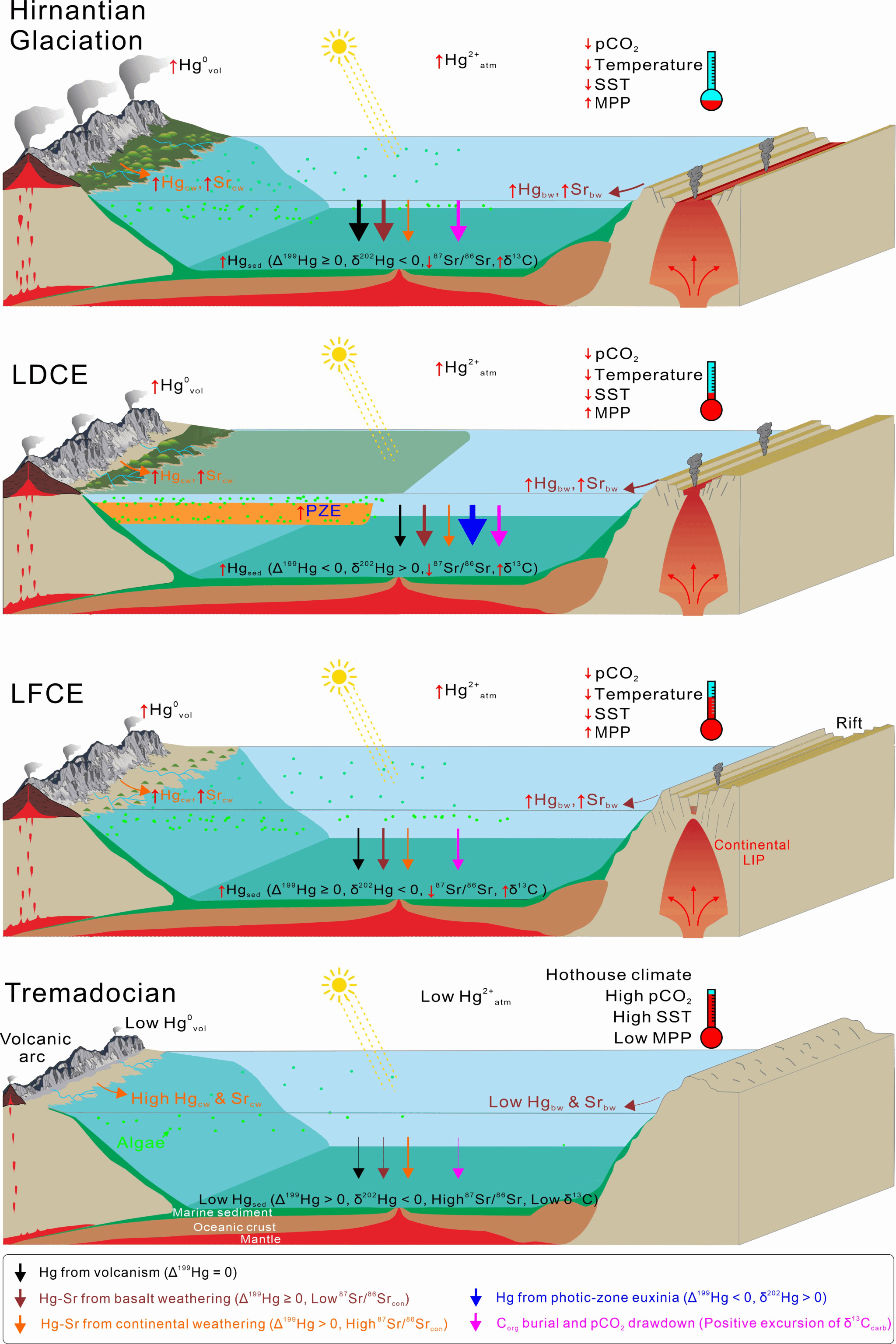 为破解这一关键科学问题,郝芳院士团队成员赵赫特任教授联合中国地质大学(武汉)张磊副研究员以及美国辛辛那提大学Thomas Algeo教授等,在郝芳院士的指导下,关于奥陶纪长期降温事件的背后驱动机制方面取得重大进展。研究团队基于华南两条奥陶纪“金钉子”剖面及一条“金钉子”辅助剖面的高精度生物地层格架,首次系统重建了贯穿整个奥陶纪的极端气候(古温度)与火山活动序列;发现了奥陶纪气候存在早-中奥陶世之交(LFCE,Floian期晚期降温事件)与中-晚奥陶世之交(LDCE, Darriwilian期晚期降温事件) 两次明确的全球性降温事件,并与赫南特冰期共同构成“三幕式”冰室气候精细演变模式;基于显生宙大数据和研究剖面多种Hg元素富集指标的阈值,识别出奥陶纪在Floian晚期、Darriwilian末期至Sandbian、Katian中期、Katian晚期至Silurian早期多阶段火山来源Hg的增强信号;精细刻画了汞同位素分馏的控制机理具有阶段性特征:在~485-473 Ma 和~468-448 Ma 区间,主要由大陆风化作用(尤其是玄武岩风化)及海洋透光带硫化环境(PZE)主导,而在 LFCE 事件和Hirnantian冰期期间,则主要由火山活动主导的控制机理;首次系统揭示了大火成岩省火山作用(而非大陆弧火山作用)与奥陶纪长期气候变冷之间的耦合关系,提出了“大火成岩省火山活动—玄武岩风化—碳封存—气候变冷”的核心新机制,挑战了以造山运动和早期植物扩张为主导的传统观点。该研究将奥陶纪气候变化的驱动机制从“地表主导”的传统模型转向“深部过程驱动-地表反馈放大”的新范式,为审视当今全球气候变化进程和地球宜居性演变提供了新的案例与关键科学依据。