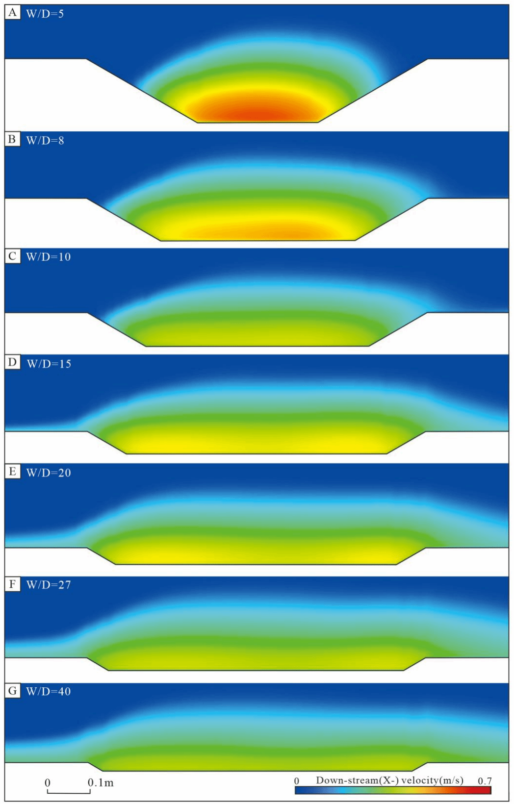 图3. 不同宽深比下的重力流方向流速