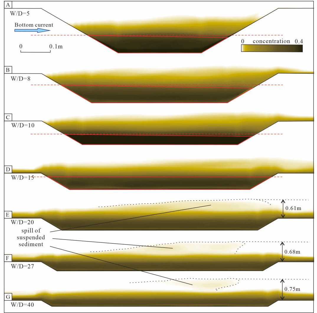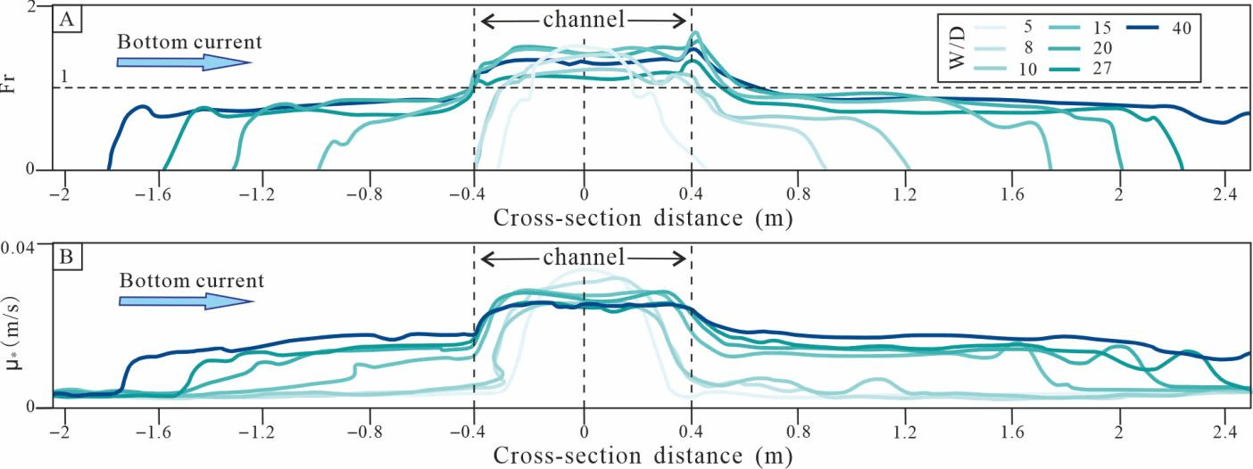 研究结果表明,水道限制性的变化调控着重力流与底流交互作用强度,进而改变水道内流速分布和二次流环流结构,最终影响近床底沉积物的动力学响应。随着宽深比增加,交互作用增强,水道内二次流位置由顺底流一侧移至逆底流一侧,相应地,近床底沉积物的优势输运方向亦由向底流上游偏移转变为向底流下游偏移。①对于极强限制性水道:底流影响主要位于水道上方,重力流则基本限制在水道内部,两者交互作用极弱。水道内流体行为与无底流时的重力流类似,受湍流各向异性主导的二次流控制,因此水道基本不发生侧向迁移。②对于中等限制性水道:此类水道具有较小宽深比,但底流已能对重力流产生显著影响。交互作用下在水道下游形成由底流重力流剪切压力差驱动的二次环流,将下游近床底沉积物输运至上游堆积,促使水道整体向下游迁移。③对于较弱限制性水道:宽深比较大,重力流底流交互作用较强。底流翻越水道壁后直接下沉,将沉积物输移至下游堆积,而上游形成的二次环流极弱。该机制导致水道倾向于向上游迁移。