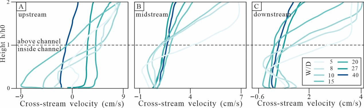 图4. (A)上游、(B)中游及(C)下游处沿水道轴线的重力流方向流速分布。由于模拟案例具有不同的水道深度,故对深度进行归一化处理,以便在不同宽深比条件下进行跨案例比较