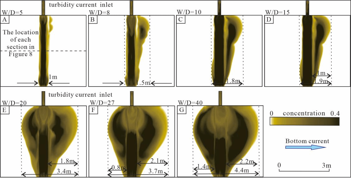 针对上述问题,研究基于对前人地震资料的分析和数值模拟手段,构建了一系列具有不同宽深比的水道模型,依托Fluent数值模拟平台,采用基于有限体积法的欧拉多相流模型,求解海水—沉积物颗粒的质量与动量守恒方程,系统分析重力流—底流交互背景下流体—沉积耦合行为。通过比较不同宽深比条件下水道内的流体结构特征,从流体动力学角度深入探讨重力流与底流共同控制下不同限制性水道的迁移机制。